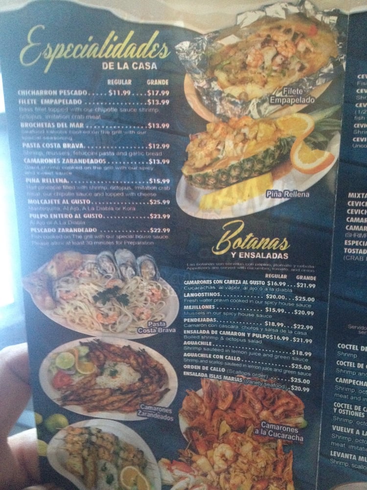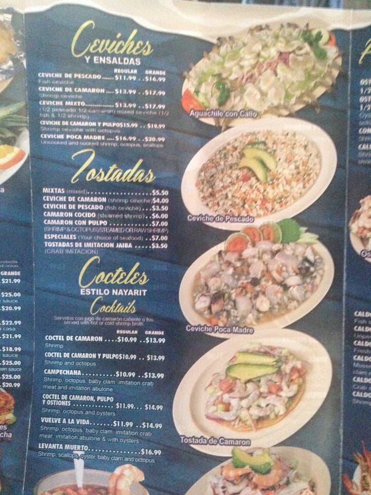 Una combinacin de aguachile, callo, camaron cocido, pulpo, y ostin servido en una salsa negra de casa. Va acompaado de pepino, tomate y cebolla. A combination of deveined shrimp (aguachile), scallops, boiled shrimp, octopus and oyster drowned in a house dark sauce. It is served with tomato, pepino, onion.